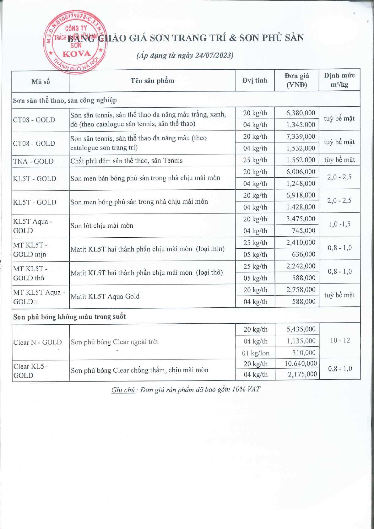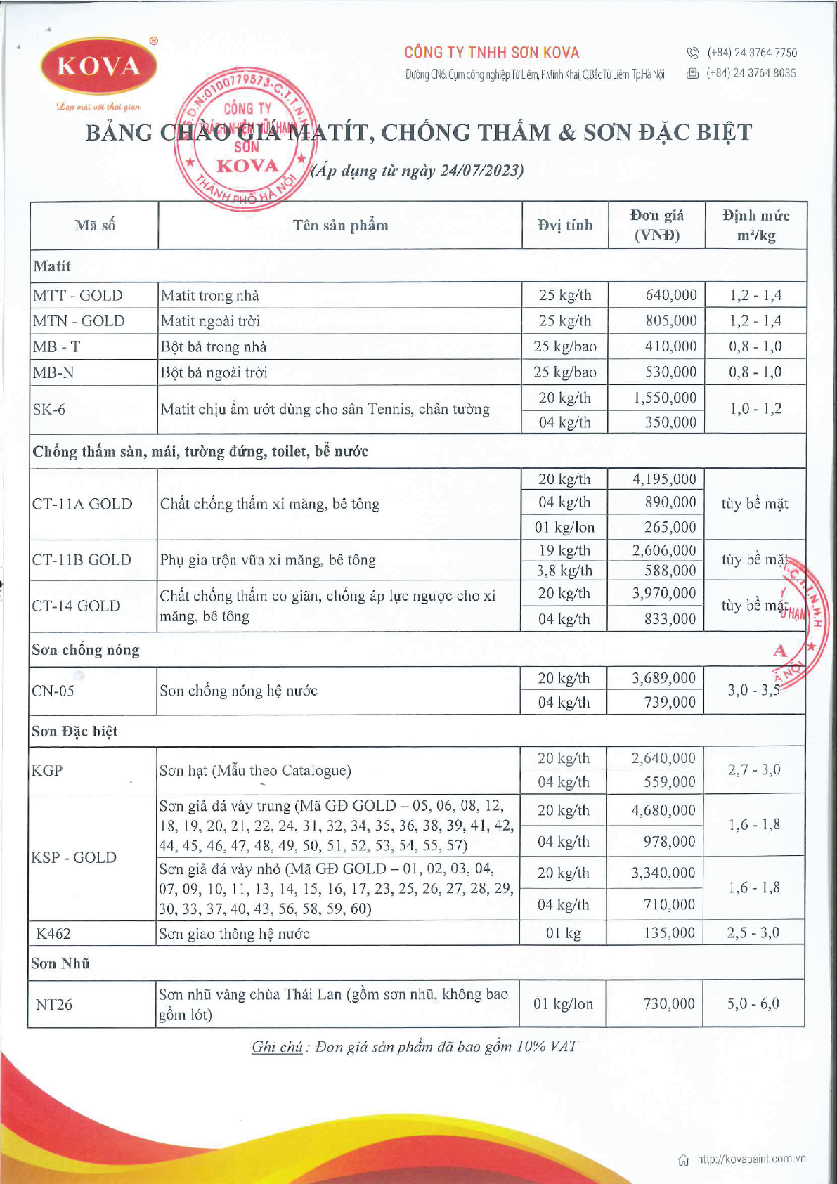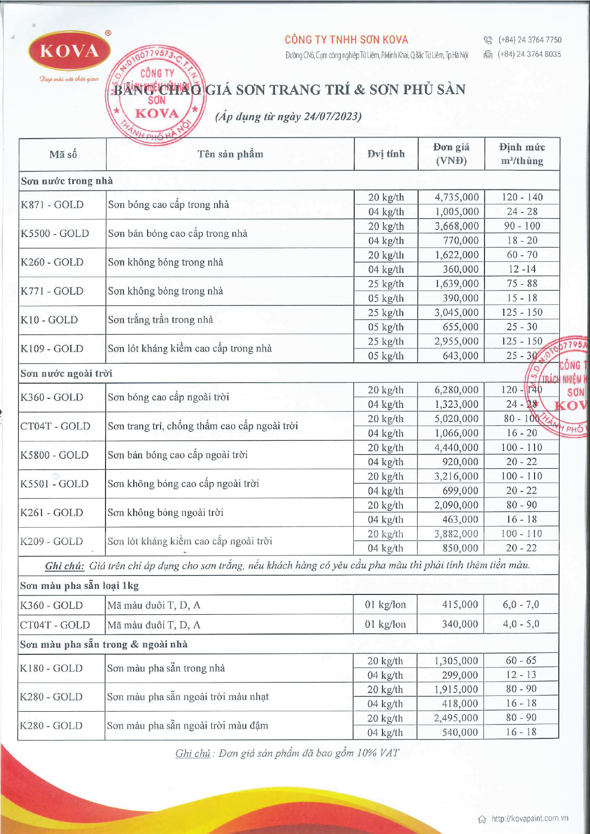 Trước sự biến động của thị trường dẫn đến giá nguyên vật liệu đầu vào và chi phí sản xuất tăng cao, Công ty TNHH Sơn KoVa đã nỗ lực, cố gắng để chất lượng sản phẩm luôn được nâng cao cùng với giá thành sản phẩm luôn được bình ổn để quý khách hàng yên tâm sử dụng. Tuy nhiên, do nguồn nguyên liệu nhập khẩu chịu tác động mạnh của thị trường thế giới, kể từ ngày 24.7.2023, Công ty TNHH Sơn KoVa chính thức áp dụng “Bảng chào giá Sơn trang trí, sơn phủ sàn, mattit, chống thấm và Sơn đặc biệt” và ” Bảng chào giá màu KoVa” dành cho người tiêu dùng với đơn giá mới cho hệ thống sản phẩm của Công ty chúng tôi (chi tiết đính kèm theo Thông báo).